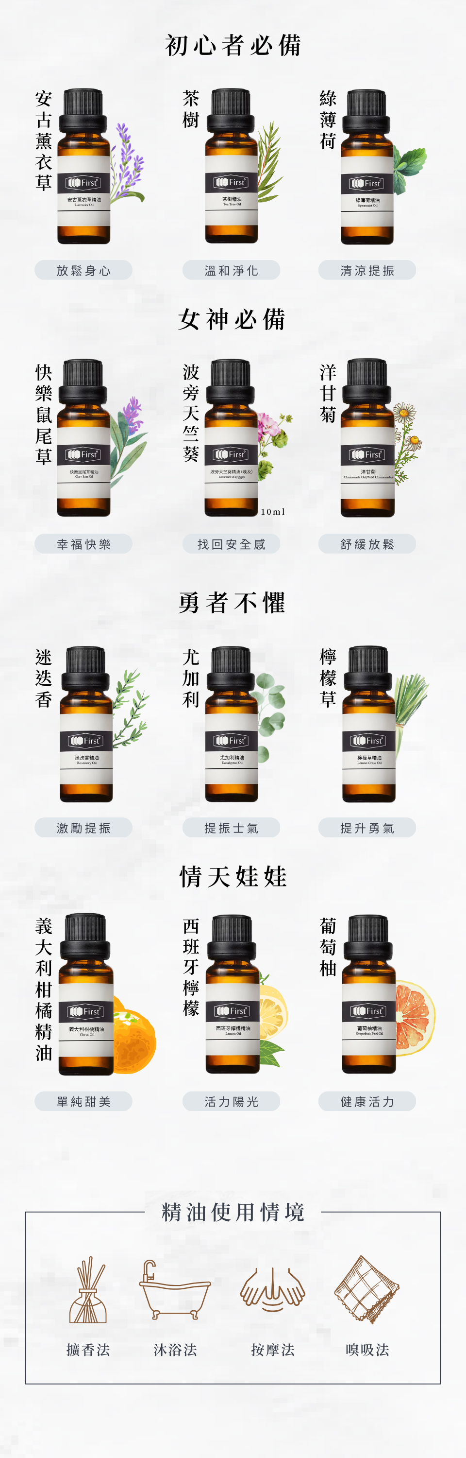 ※除波旁天竺葵為10ml,其他精油皆為20ml。