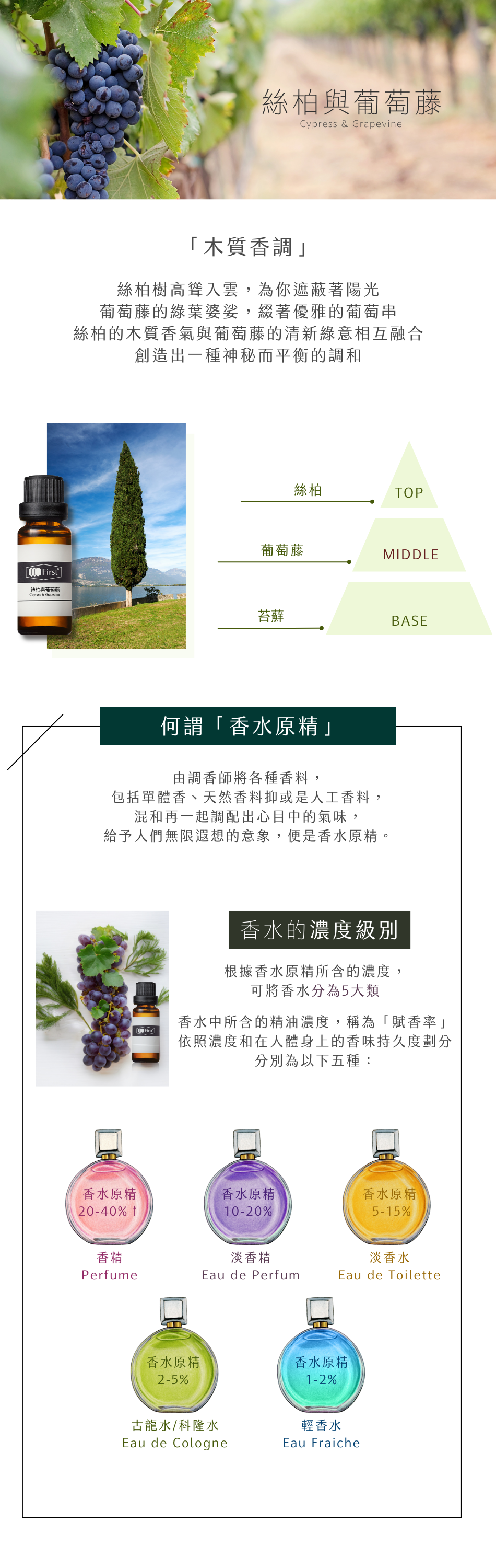 | Product Description | 【This item cannot be shipped to international destinations.】 Cypress and Grapevine fragrance captures the unique charm of a woody composition. In the top notes, the scent of cypress is fresh and vibrant, reminiscent of being surrounded by lush green forests. The middle notes of grapevine bring a touch of natural sweetness and the captivating allure of fruity notes, enchanting the senses. In the base notes, the aroma of moss evokes a sense of nature and simplicity, creating a deep and comforting ambiance. 【Related product recommendations】 1.Store it in a safe place:12格精油木盒 / 20ML盒子。 2.Aromatic Diffuser Companion >> 酒精、擴香基劑、擴香竹、擴香瓶 |
