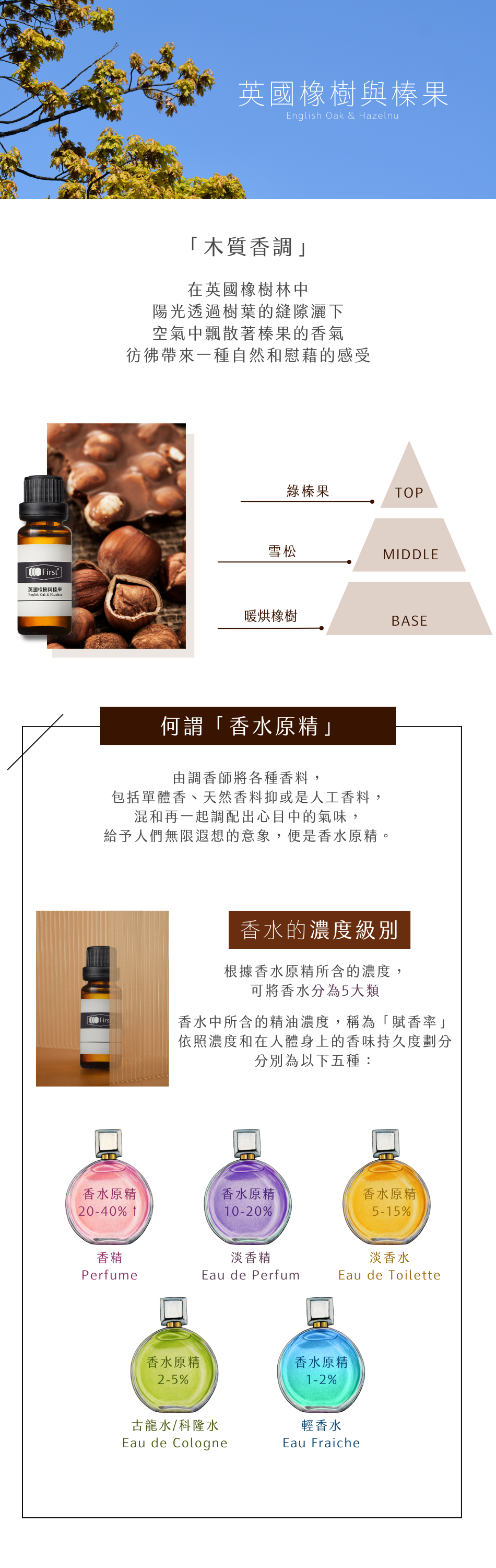 | 產品詳述 | 【無法配送國外地區】 以綠榛果的清新開始,中味中展現出雪松的香氣,最後在後味中烘烤出暖暖的橡樹香。彷彿帶給人一種充滿力量和深度的感受,置身於英國的橡樹林中,享受大自然的恩賜。 【相關建議商品】 1.存放好幫手:12格精油木盒 / 20ML盒子。 2.擴香好幫手 >> 酒精、擴香基劑、擴香竹、擴香瓶 |