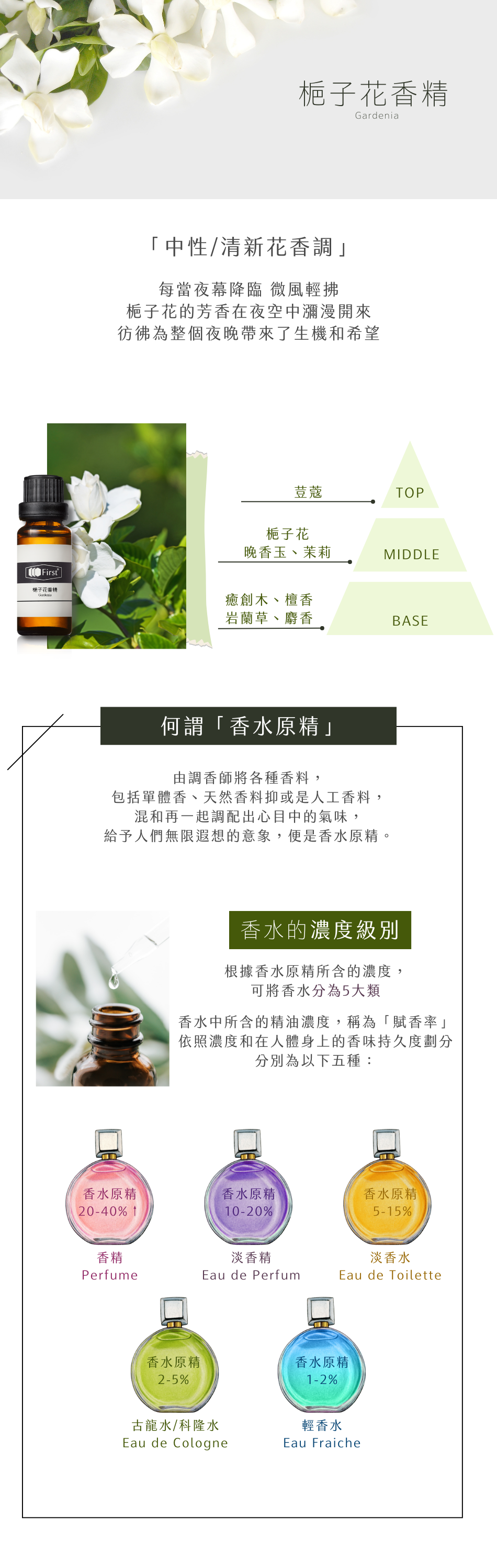 | 產品詳述 | 【無法配送國外地區】 前調以荳蔻、梔子花、晚香玉、茉莉精緻優雅的香氣為開端,後續覆癒創木、檀香、岩蘭草、麝香的木質氣息,是一款清新花香。 【相關建議商品】 1.存放好幫手:12格精油木盒 / 20ML盒子。 2.擴香好幫手 >> 酒精、擴香基劑、擴香竹、擴香瓶 |
