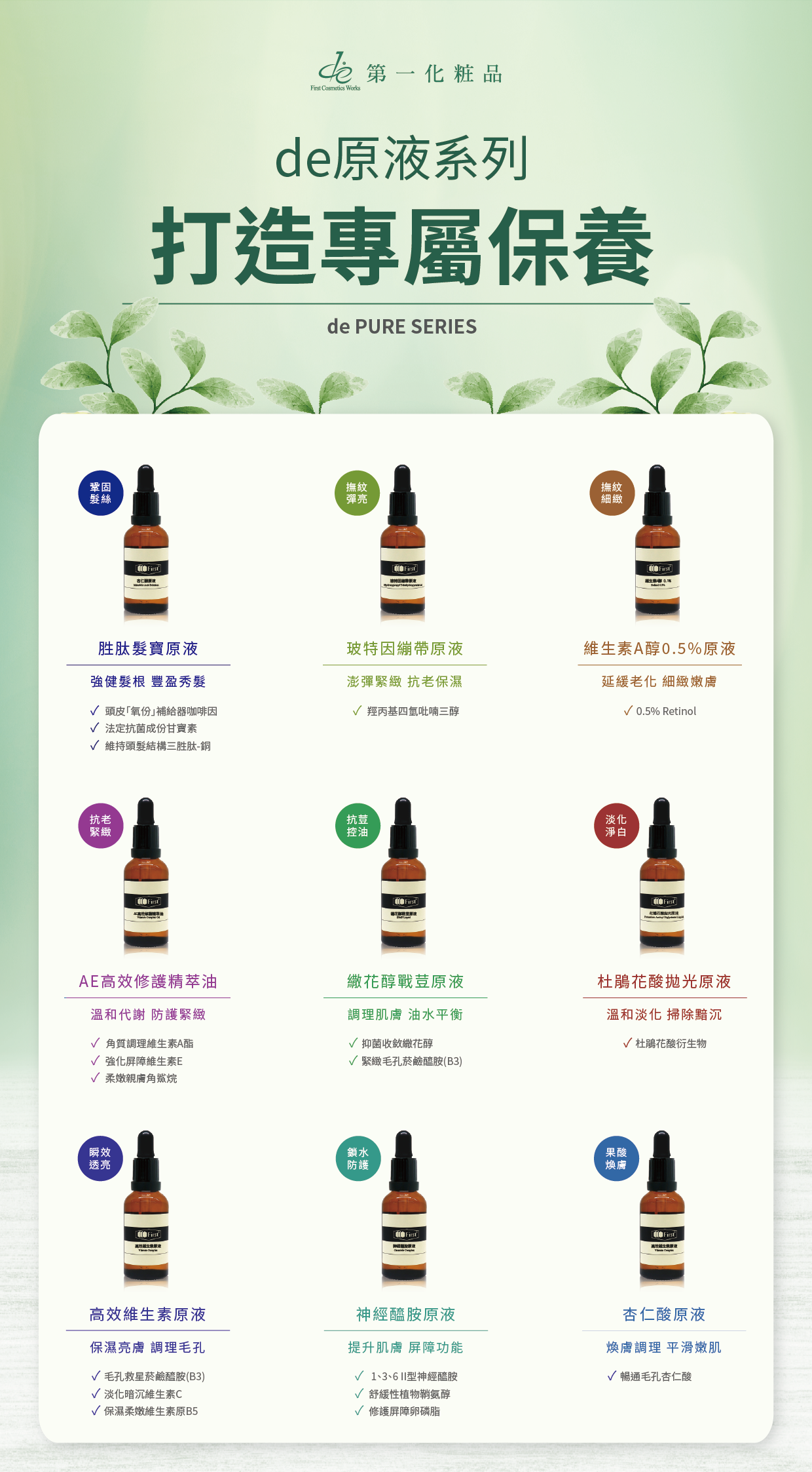 A:de的原液系列推薦給一般大眾入門款,一年四季均可添加的肌膚營養,繖花醇原液無添加任何酸類成分,是溫和而且經過認證的抑菌成分,不管是一般肌膚或者是荳荳肌膚均可安心使用。