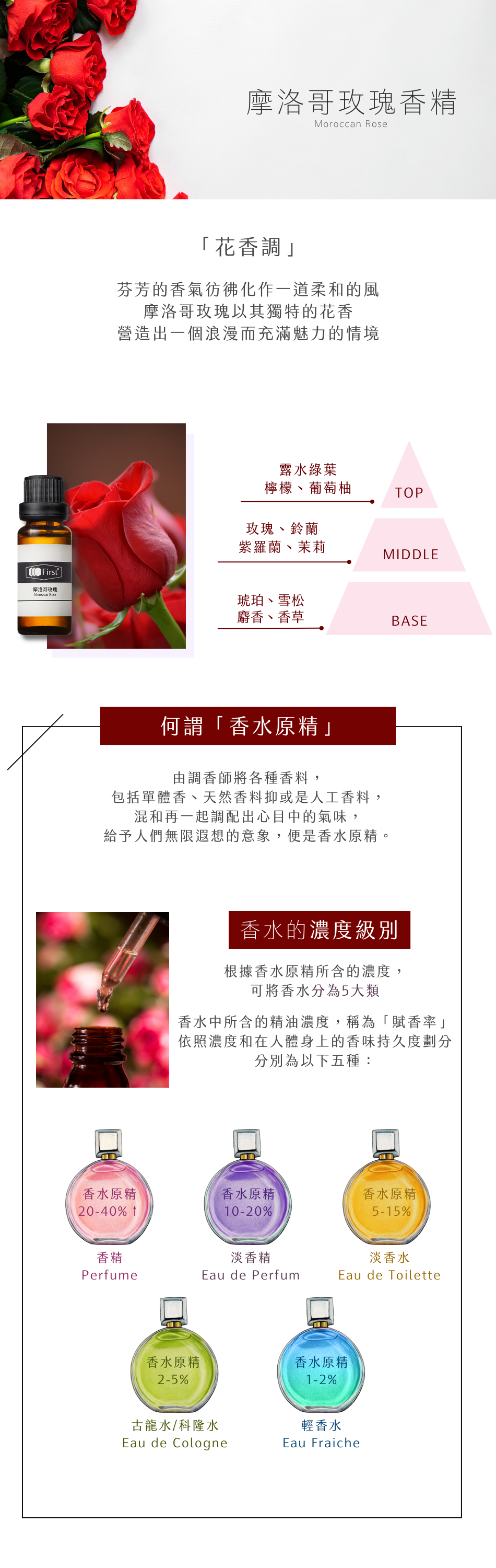 | Product Description | 【This item cannot be shipped to international destinations.】 Moroccan Rose fragrance exhibits the distinct characteristics of a floral composition. In the top notes, the fresh scent of dewy green leaves and citrus intertwines with a vibrant citrus ambiance, bringing a touch of pleasure and vitality. The middle notes of Moroccan rose, lily of the valley, violet, and jasmine shimmer together, releasing a captivating floral fragrance that enchants the senses. In the base notes, the aroma of amber, cedarwood, musk, and vanilla blend harmoniously, creating a deep and warm atmosphere. 【Related product recommendations】 1.Store it in a safe place:12格精油木盒 / 20ML盒子。 2.Aromatic Diffuser Companion >> 酒精、擴香基劑、擴香竹、擴香瓶 |