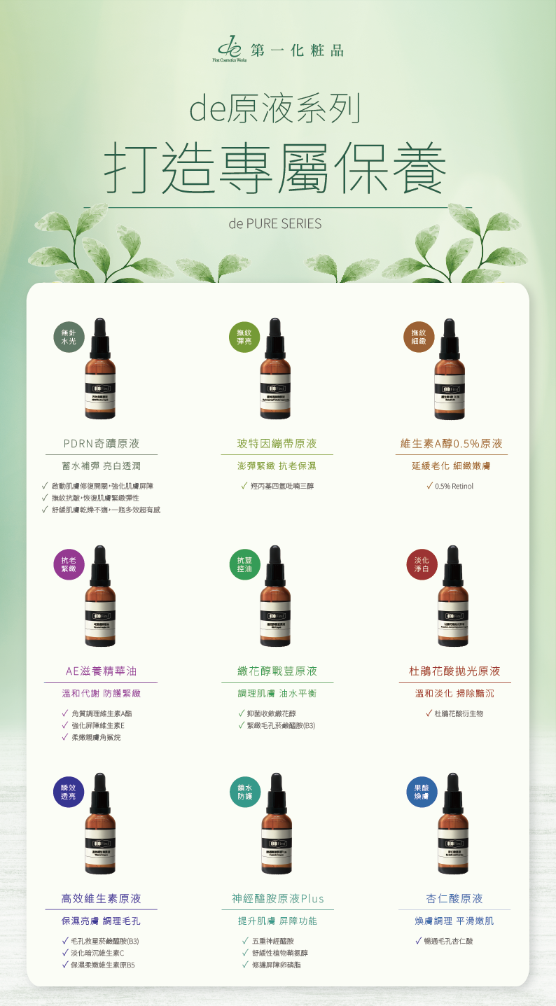 但de原液系列因濃度較高,建議添加在現有保養品中稀釋使用。