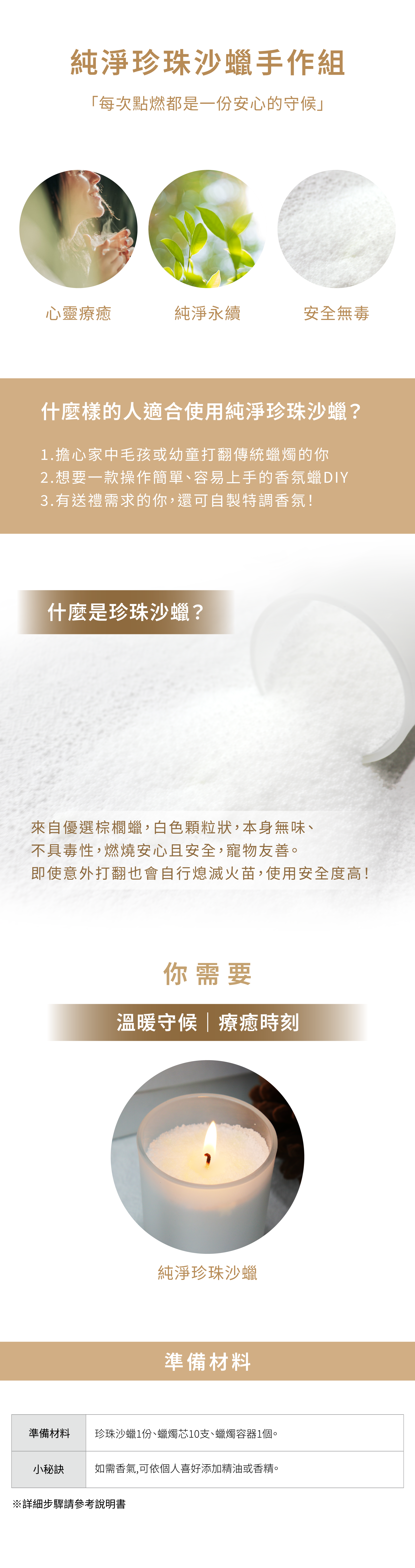 來自優選棕櫚蠟,白色顆粒狀,本身無味、不具毒性。