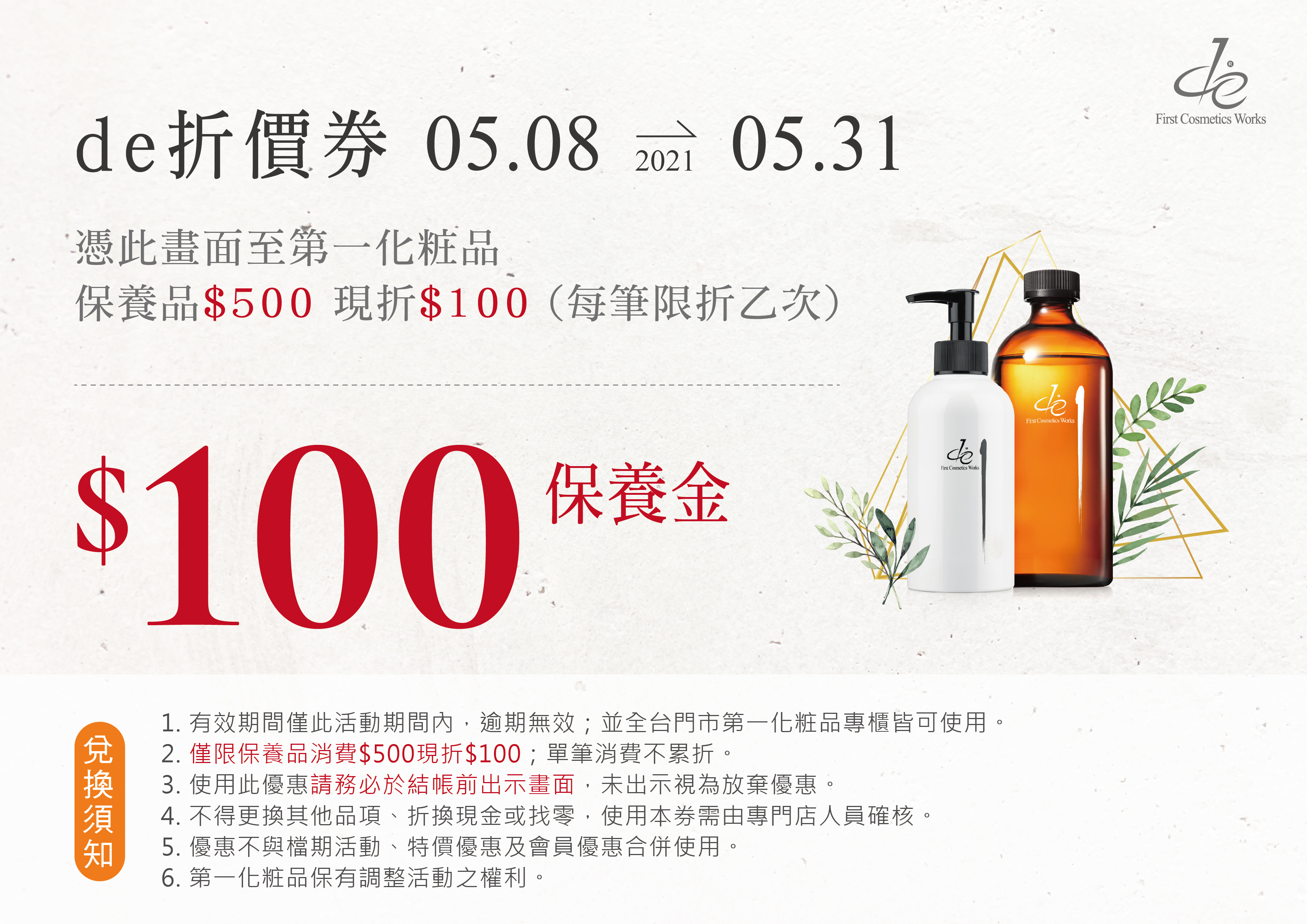 兌換內容:憑此畫面可至第一化粧品消費保養品$500現折$100(每筆限折乙次,不累折)