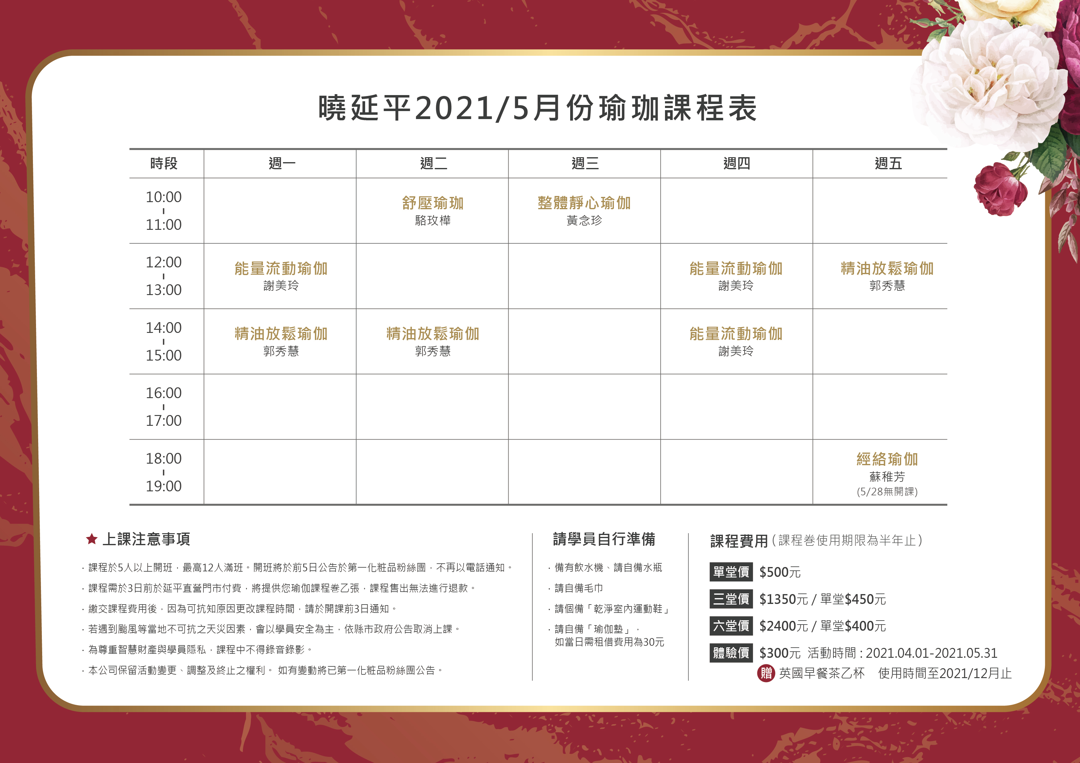 .課程需於3日前於延平直營門市付費,將提供您瑜伽課程巻乙張,課程售出無法進行退款。