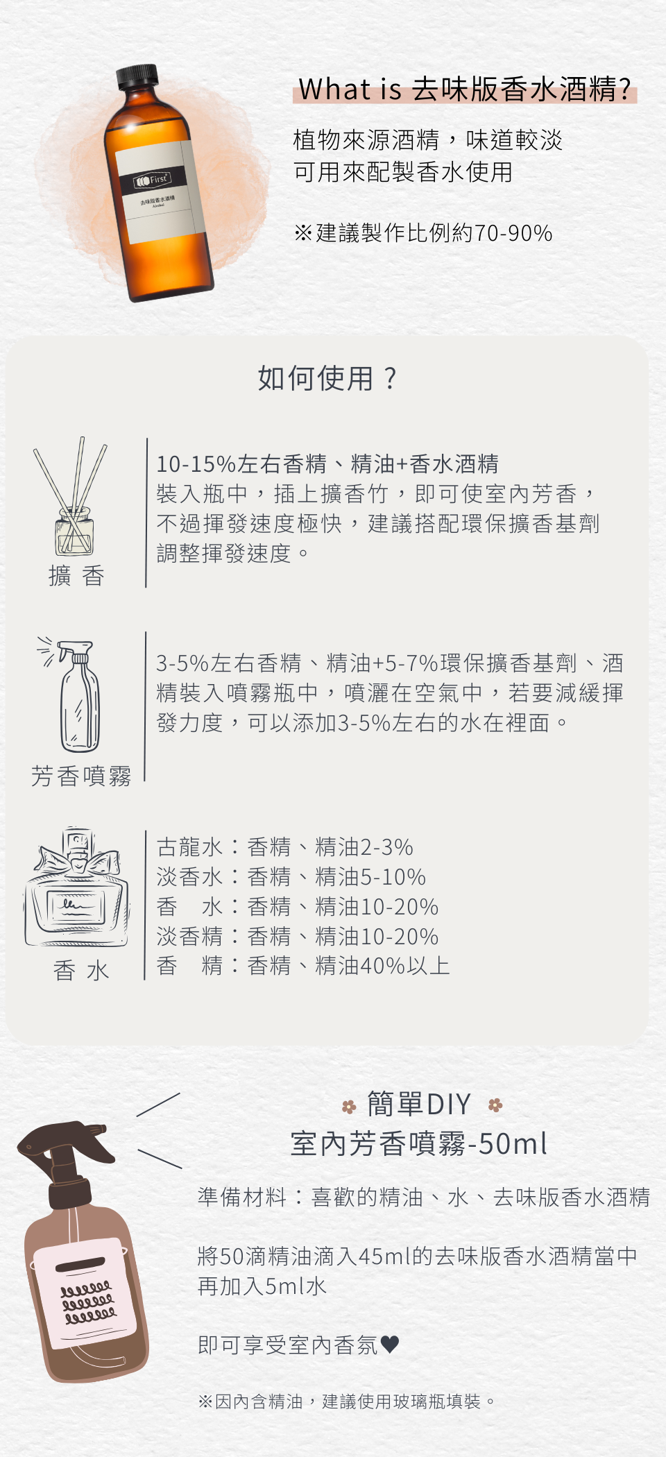 | 產品詳述 | 植物來源酒精,味道較淡,可用來配製香水使用。 |