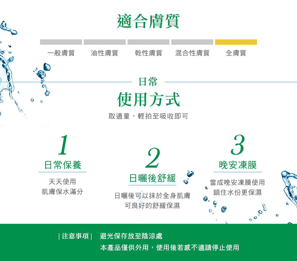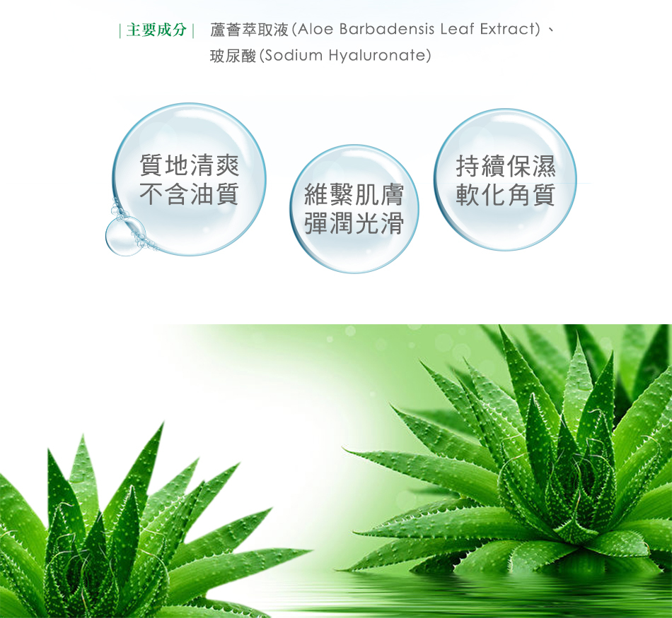 產品用途• 幫助肌膚保濕潤澤• 幫助修護脆弱肌膚• 賦予肌膚活力與光澤主成分蘆薈萃取液|幫助肌膚保濕潤澤玻尿酸|鎖住肌膚水分並維持肌膚彈潤使用方法:取適量,輕抹至吸收即可。
