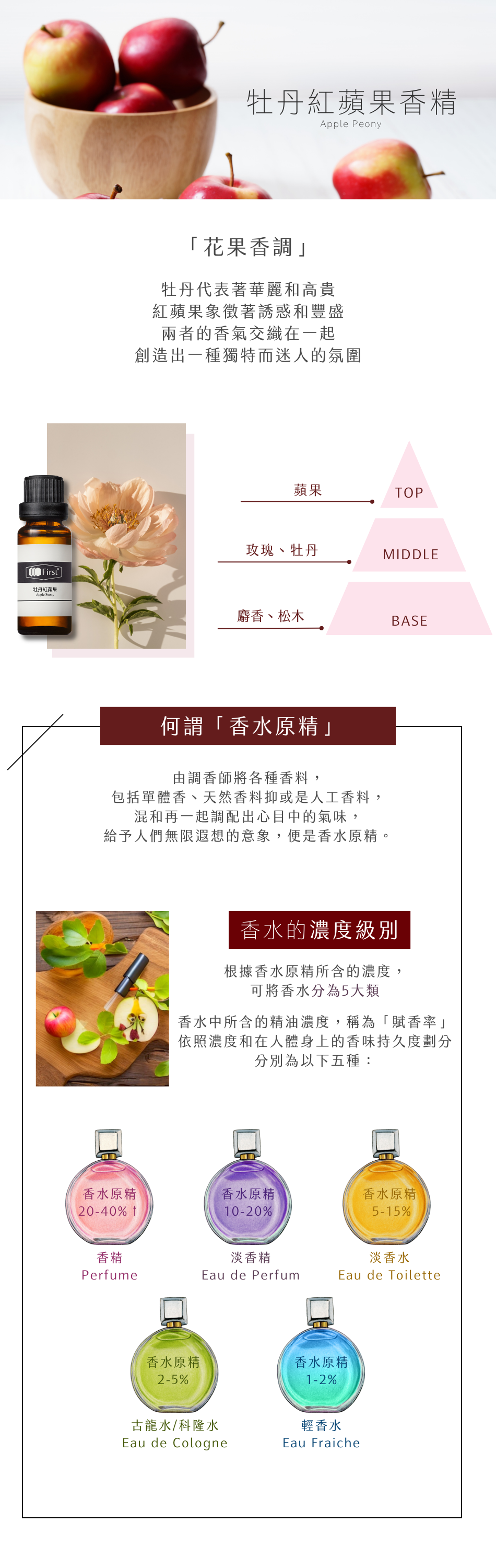| 產品詳述 | 【無法配送國外地區】 牡丹紅蘋果香精鮮採香甜的紅蘋果香,點綴出玫瑰與牡丹的清新,搭配沉穩舒適的麝香木,結合出香中帶甜的可愛香氛。 【相關建議商品】 1.存放好幫手:12格精油木盒 / 20ML盒子。 2.擴香好幫手 >> 酒精、擴香基劑、擴香竹、擴香瓶 |