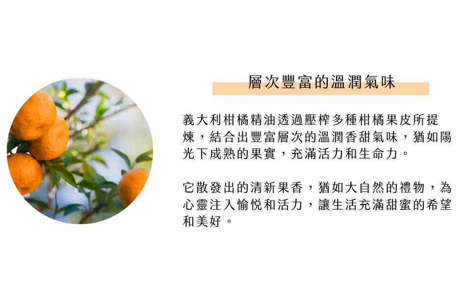 | 產品詳述 | ※ 英文:Citrus Oil ※ 學名:Citrus Species Peel Oil Expressed ※ 產地:義大利 ※ 萃取方式:壓榨 |