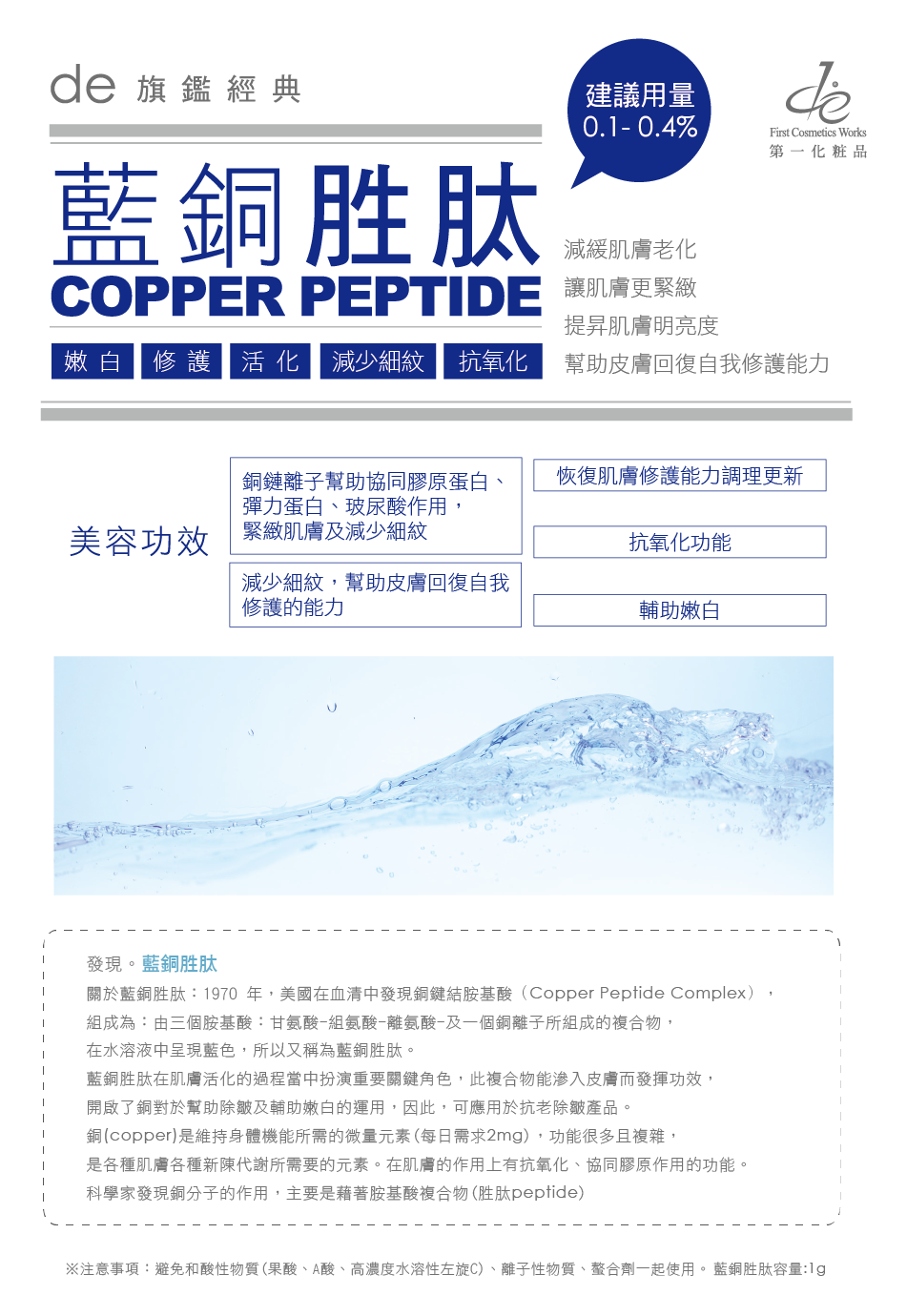 | 主成份 | 三肽-1 銅(Copper Tripeptide-1) |