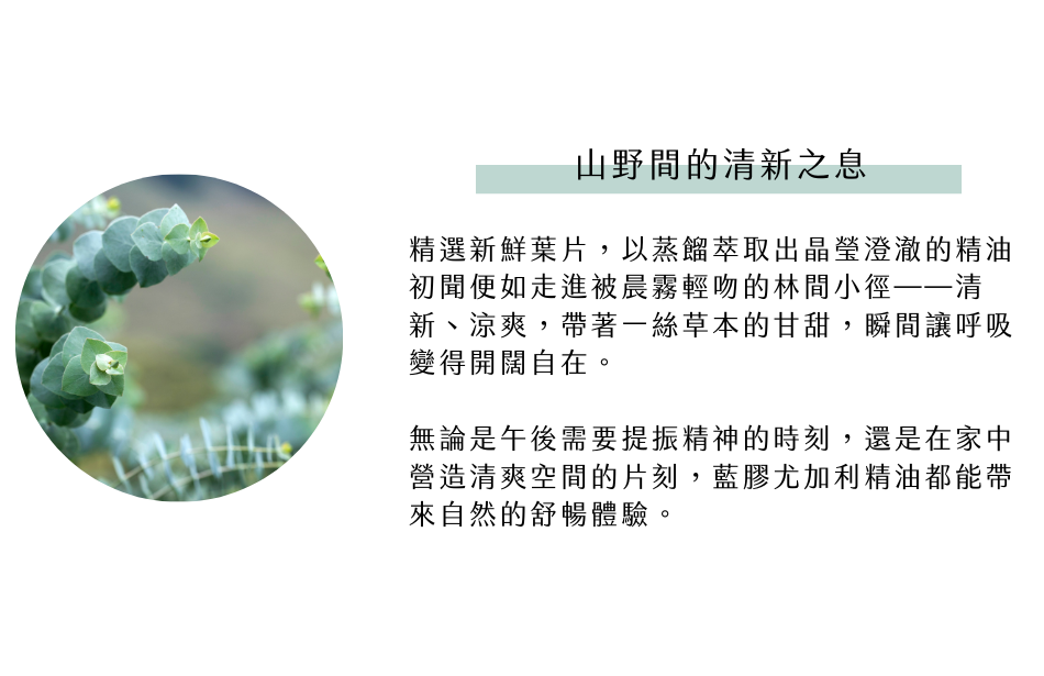 | 商品特色 | 清新舒暢 藍膠尤加利是目前市面上最常見的尤加利精油品種,其1,8-cineol桉葉油醇的含量約占70%以上,是所有尤加利品種中含量最高的一種,效果也最為強力,但因還含有微量的單萜酮成分,故刺激性較高,6歲以下嬰幼兒、年長者、孕婦、癲癇、蠶豆症患者應避免使用(嬰幼兒、年長者若欲使用可參考澳洲尤加利)。 |