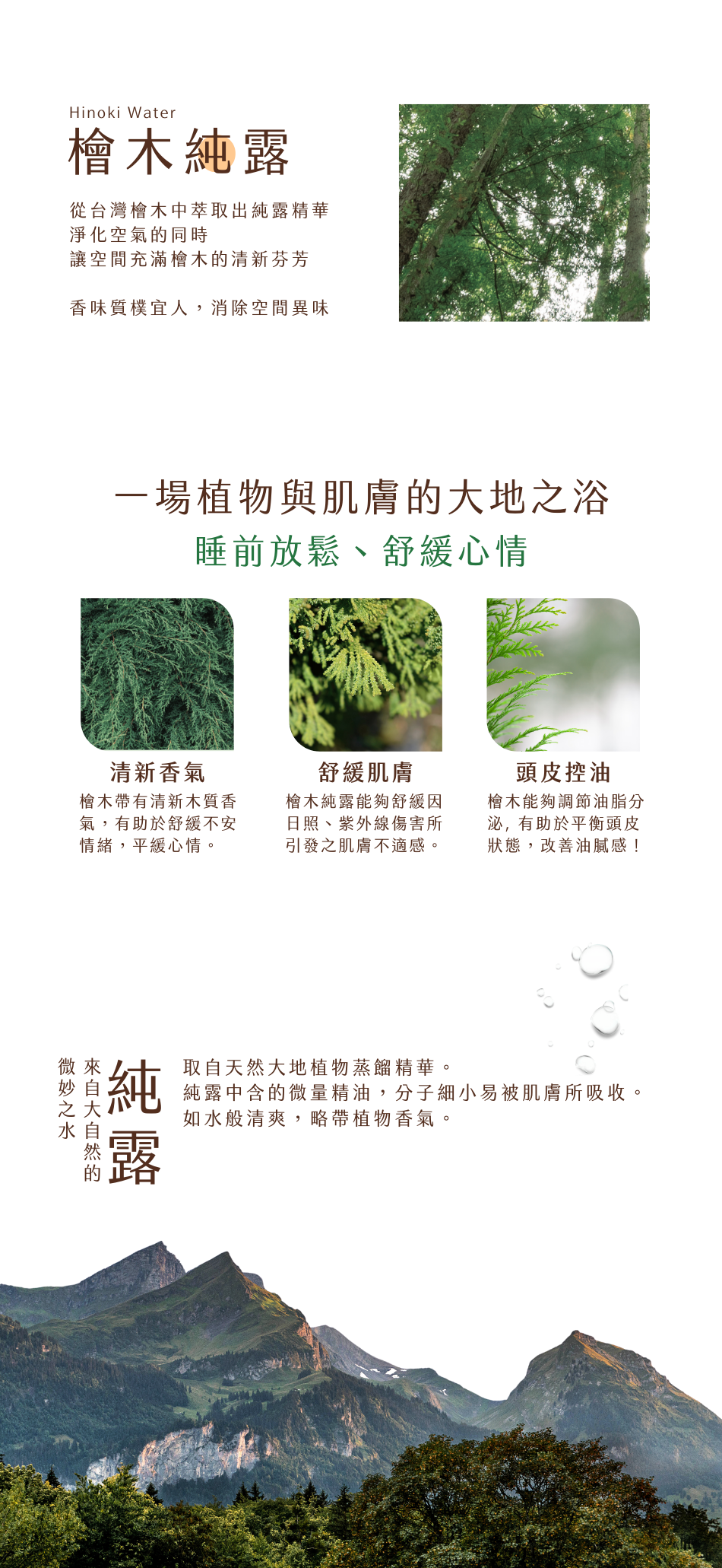| 主成份 | 檜木純露 (Chamaecyparis Obtusa Water) |