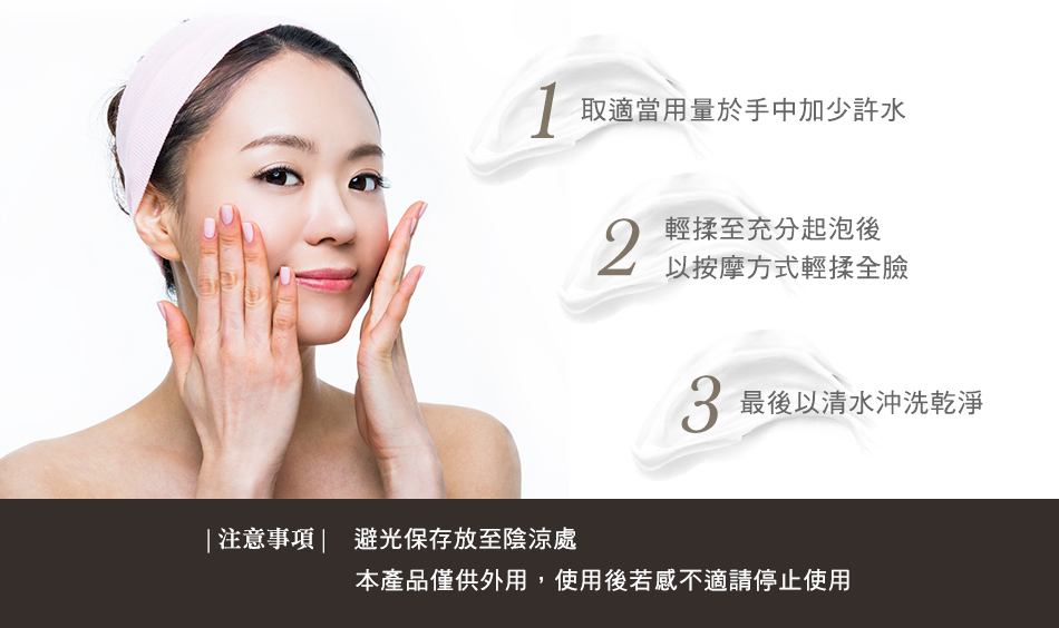使用方式:取適當用量於手中加少許水,輕揉至充分起泡後,以按摩方式輕揉全臉,再以清水洗淨。