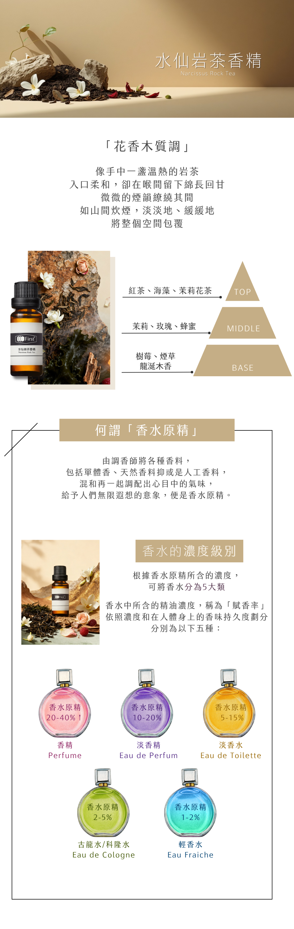 | 產品詳述 | 【無法配送國外地區】 水仙花與玫瑰交織,融合岩茶木質與淡淡煙草氣息,呈現溫潤深邃的東方茶香層次。 【相關建議商品】 1.存放好幫手:12格精油木盒 / 20ML盒子。 2.擴香好幫手 >> 酒精、擴香基劑、擴香竹、擴香瓶 |