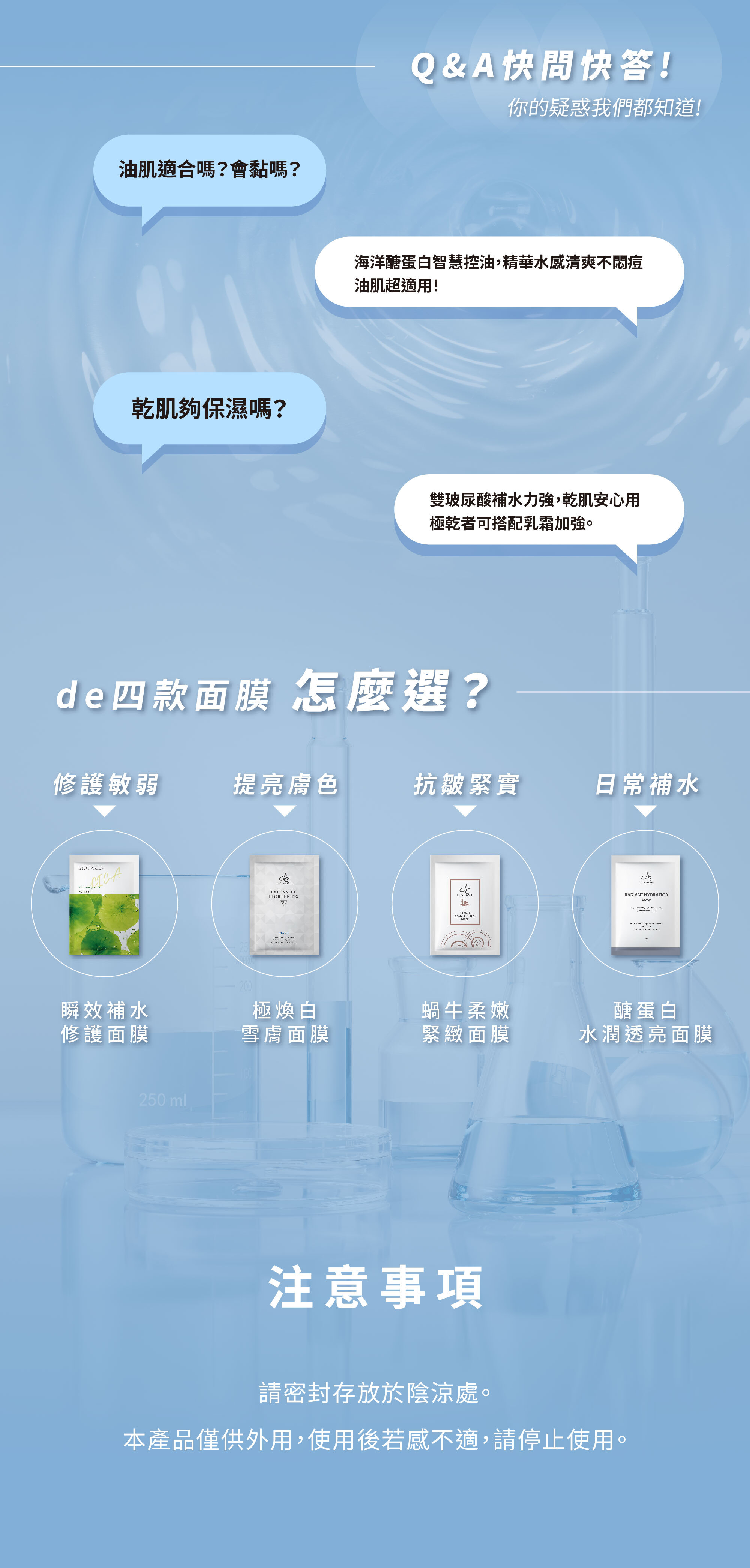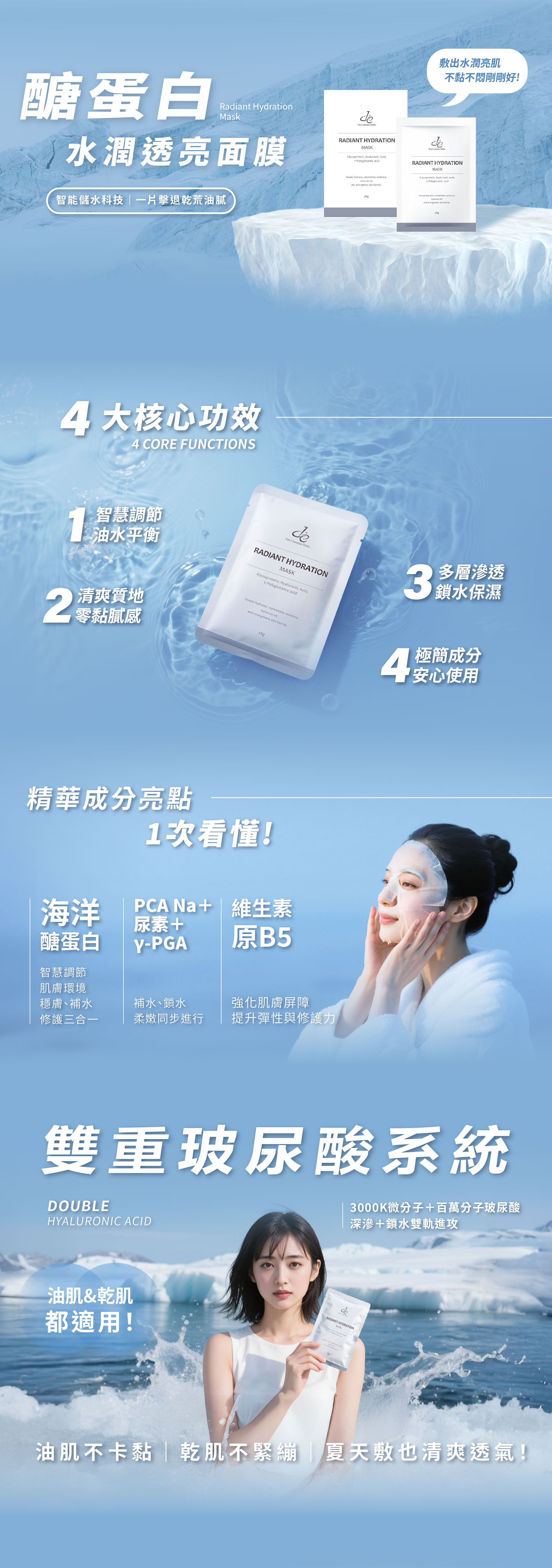 • de獨家專研瞬潤科技,一敷喚醒水光肌