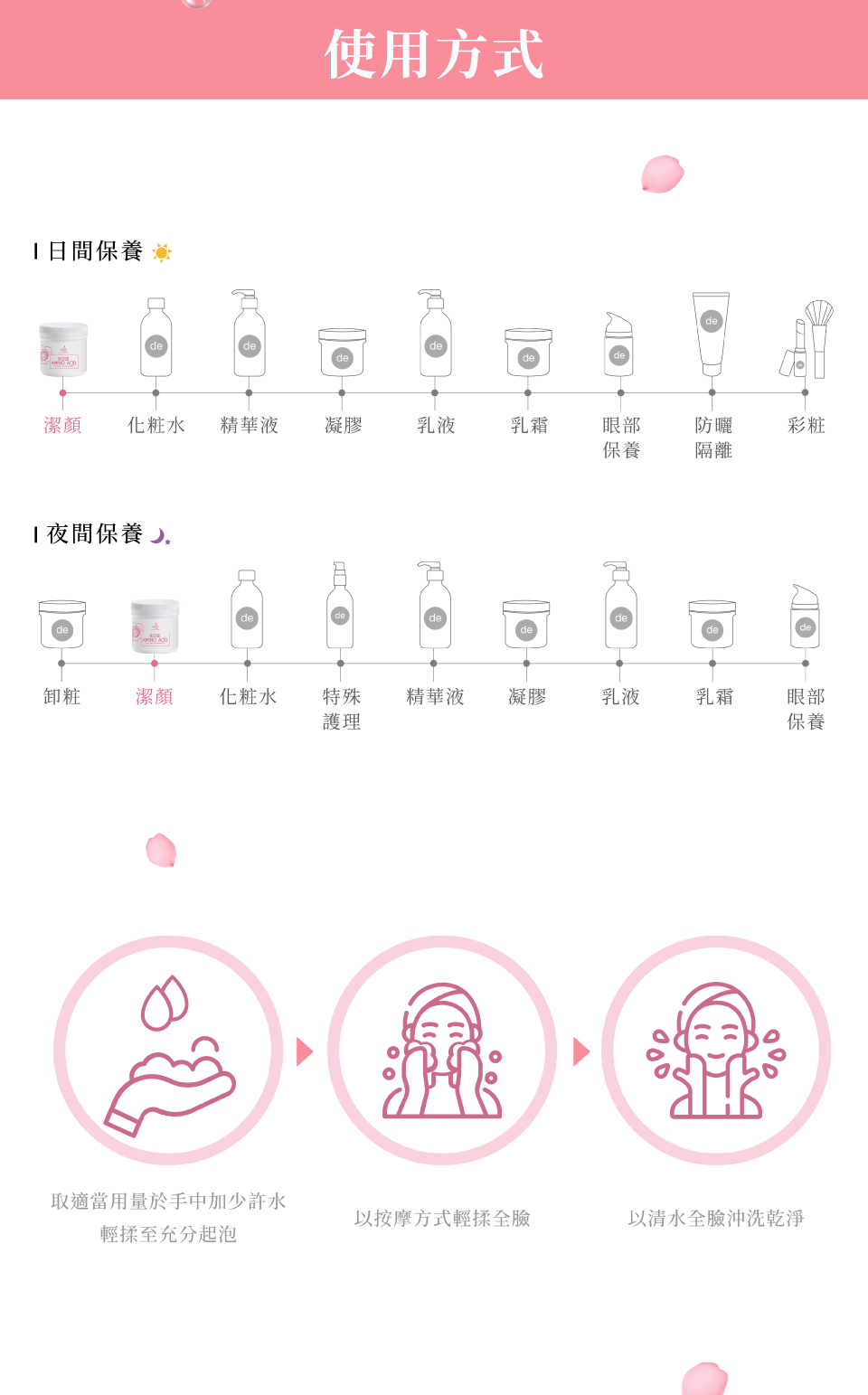 使用方法:取適當用量於手中加少許水,輕揉至充分起泡後,以按摩方式輕揉全臉,再以清水洗淨。