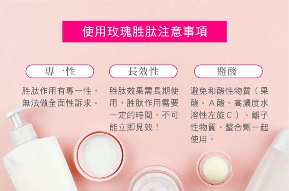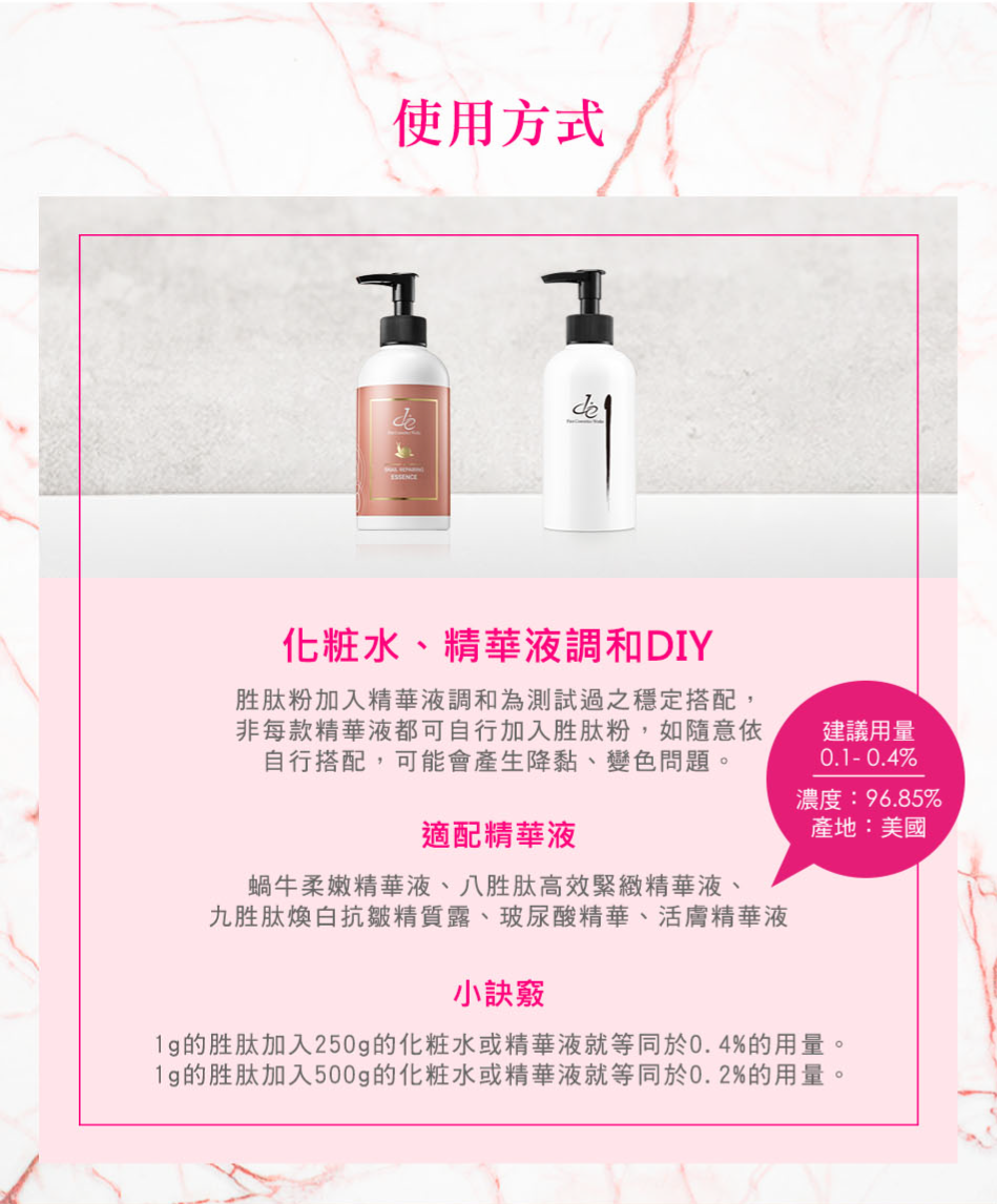 | 使用方式 | 用途/用法:供添加、調製化粧品用。 建議用量 : 0.1~0.4% 建議搭配產品:八胜肽高效緊緻精華液 de胜肽使用小撇步: ● 1g的胜肽加入250g的化粧水或精華液就等同於0.4%的用量。 ● 1g的胜肽加入500g的化粧水或精華液就等同於0.2%的用量。 ● 請依個人膚質需求斟酌添加量。 |