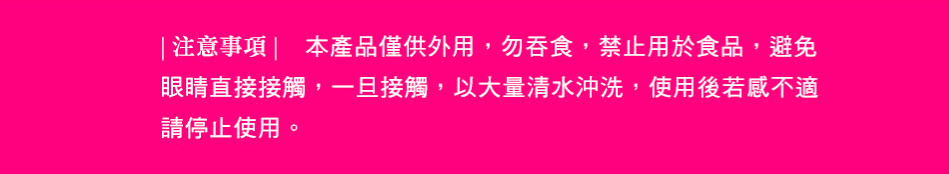 | 注意事項 | ※ 禁止用於食品 ※ 請密封避光保存放至陰涼處 ※ 本產品僅供外用,使用後皮膚若感不適,請停止使用 ※ 請依個人肌膚狀況調整產品比例或請參考相關書籍 ※ 避免直接接觸眼睛,一旦接觸,請立即以大量清水沖洗 ※ 依化粧品衛生管理條例規定,化粧品應由合法設立之化粧品工廠製造,個人自行製作之化粧品僅限自用,不得售予他人 |