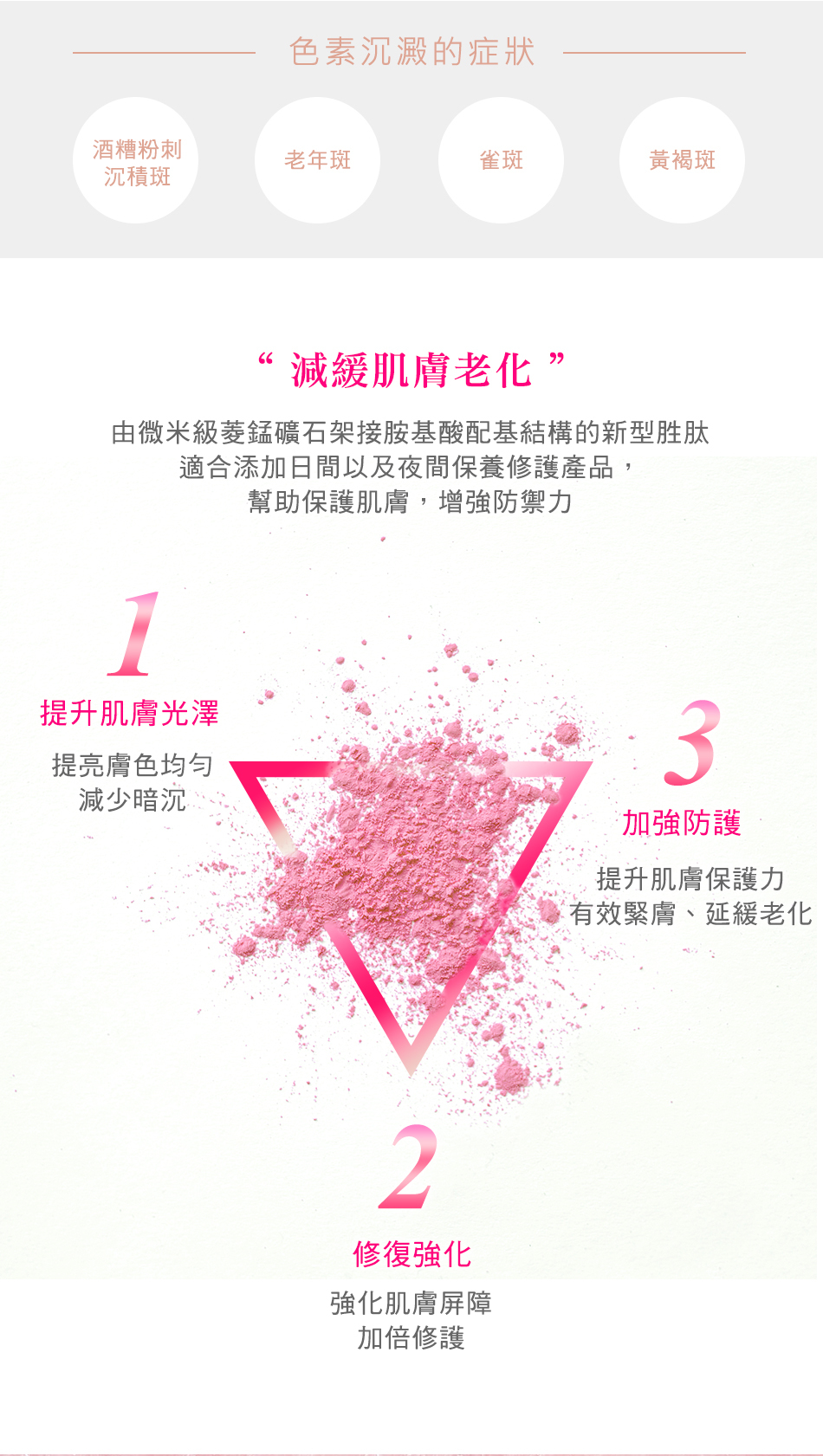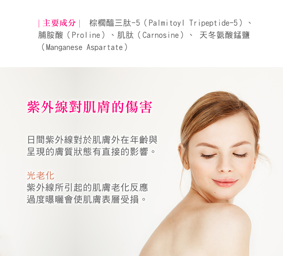 | 主成份 | 棕櫚醯三肽-5, 脯胺酸, 肌肽, 天冬氨酸錳鹽 (Palmitoyl Tripeptide-5, Proline, Carnosine, Manganese Aspartate) |