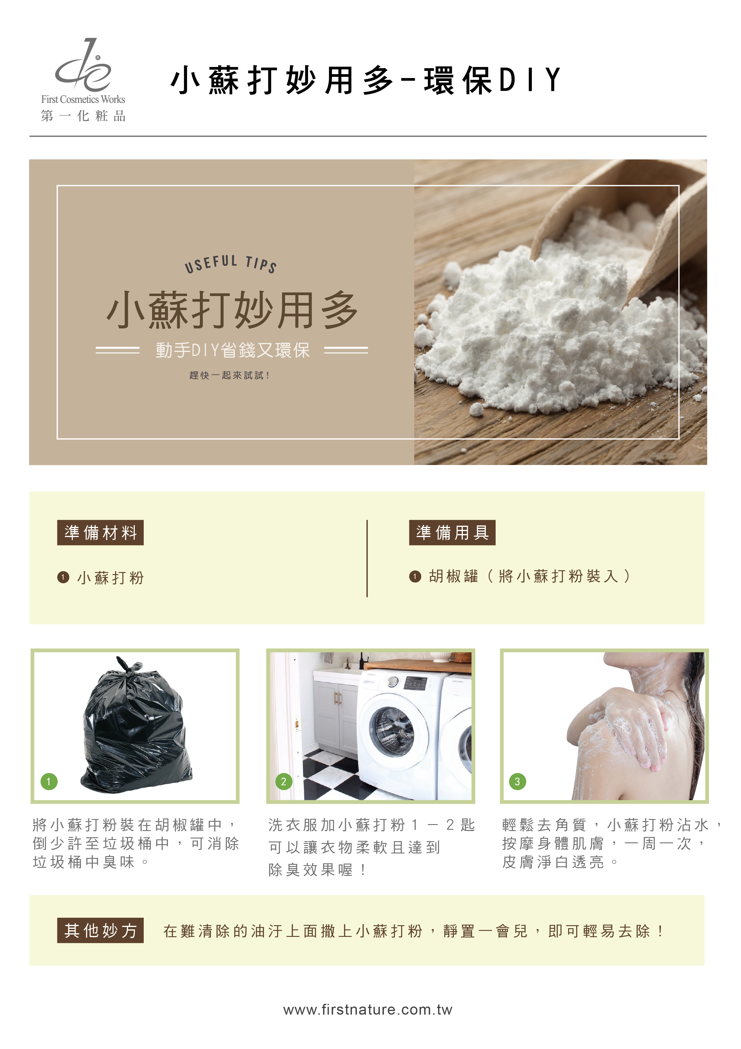 產品詳述:弱鹼性粉末狀,可作為除臭劑、泡澡粉、清潔劑;可用於泡澡產品中,溶於水中產生氣泡,添加於保養品中可軟化粉刺。