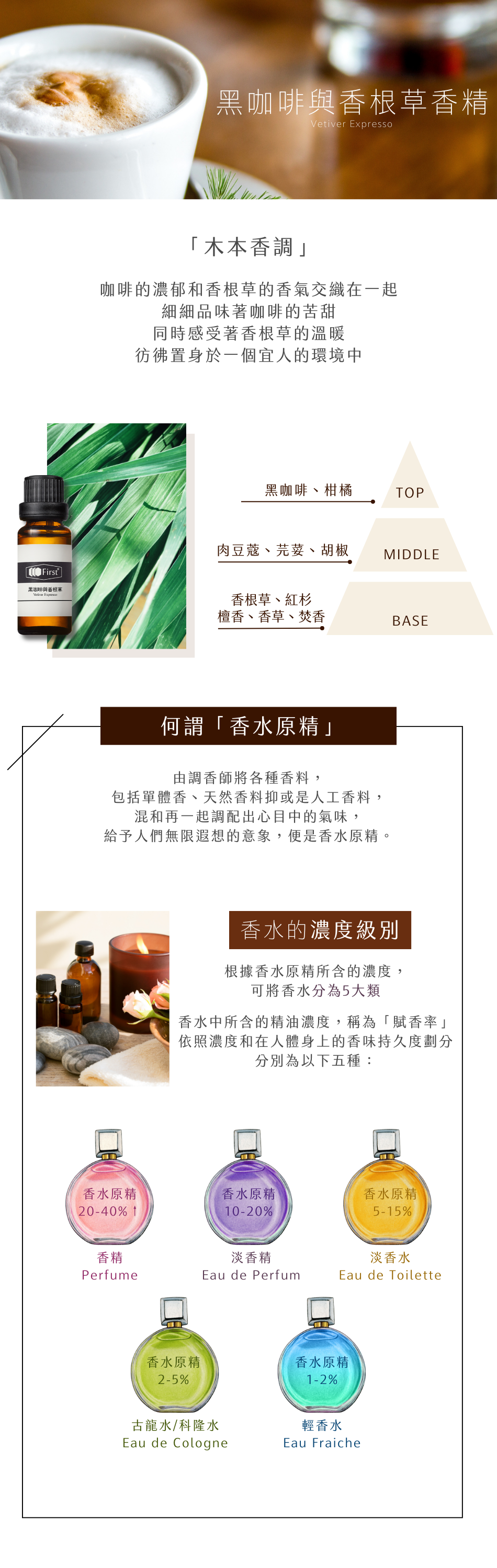 | 產品詳述 | 【無法配送國外地區】 黑咖啡與香根草香精帶給人一種濃郁而迷人的木本香調。在前味中,黑咖啡的香氣與柑橘的清新交織,營造出一種醒目而令人振奮的感覺。中味以肉豆蔻、芫荽和胡椒增添了一份辛辣和活力,為香氛注入一抹熱情。而在後味中,香根草、紅杉、檀香、香草和焚香的結合帶來了溫暖和深度,讓整個香調更加持久而引人入勝。 【相關建議商品】 1.存放好幫手:12格精油木盒 / 20ML盒子。 2.擴香好幫手 >> 酒精、擴香基劑、擴香竹、擴香瓶 |