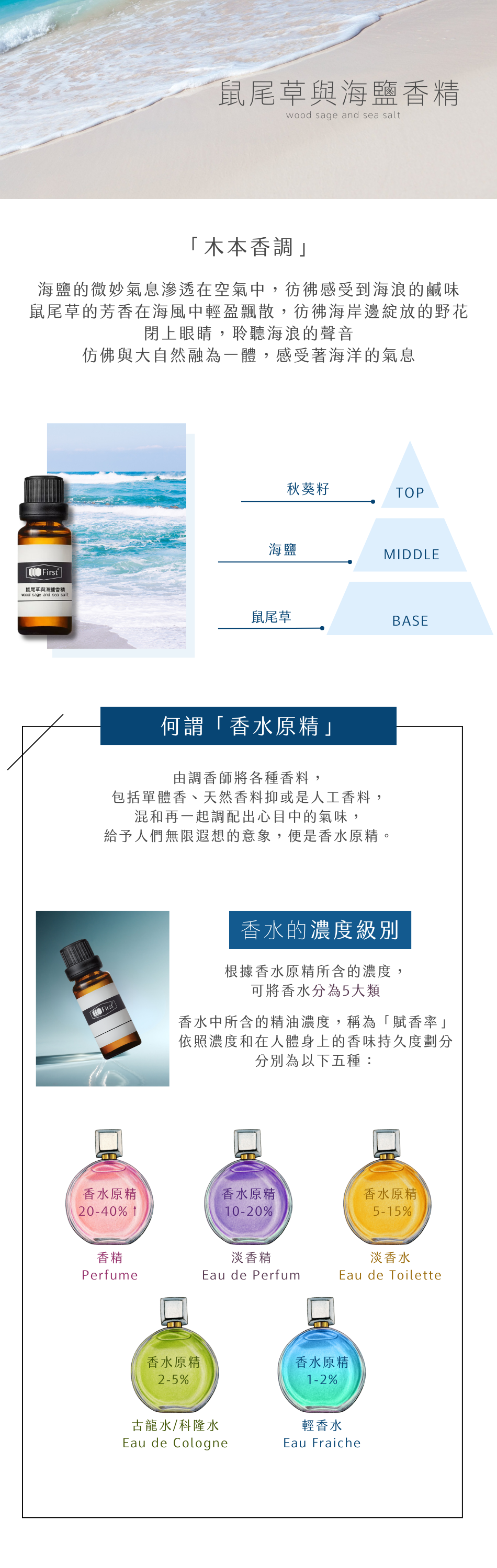 | 產品詳述 | 【無法配送國外地區】 鼠尾草與海鹽香精以木本香類為基調,展現出純樸與快樂的特質。前調以秋葵籽為主,營造出一種溫柔的氛圍。中調則以海鹽的清新香氣為主,讓您仿佛置身於海濱的氛圍中。基調運用了鼠尾草的香氣,為整個香精增添了一份自然與純淨。 【相關建議商品】 1.存放好幫手:12格精油木盒 / 20ML盒子。 2.擴香好幫手 >> 酒精、擴香基劑、擴香竹、擴香瓶 |