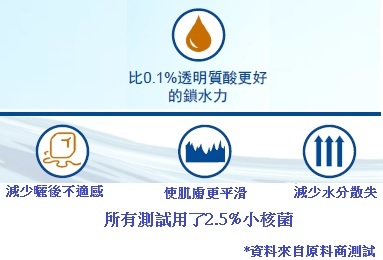 產品詳述:三螺旋结構的多效小核菌膠,能達到長效保濕及持續保水性,使用後觸感優異,另外也可以缓解泛紅狀況。結合玻尿酸和膠原蛋白的特性!具即時舒缓、保濕、光滑等多重效果。